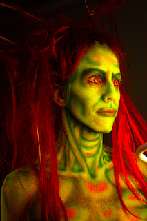 I had thought maybe we could say she is a wood sprite even though she looks more like a monster than a fairy creature. Part of why it turned out like this is my background up to this point had been mostly creature and haunted house characters. I tried doing more beauty make up on her face as to give her a more elegant look. I also had a thought of her looking at herself in a mirror like the character Narcissus from the old mythology's. Isaac happened to have this old wooden hand mirror and it brought everything together for the shoot.